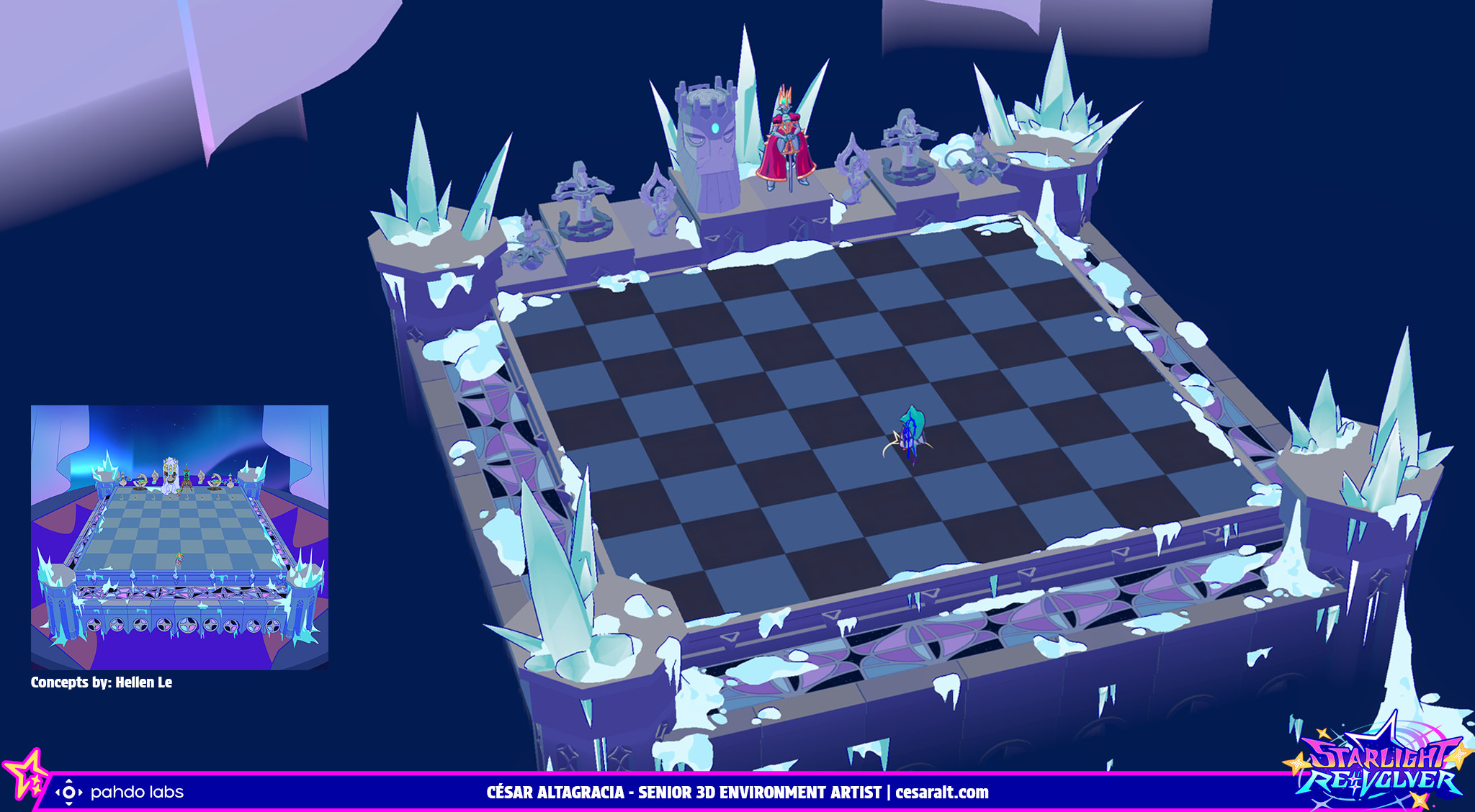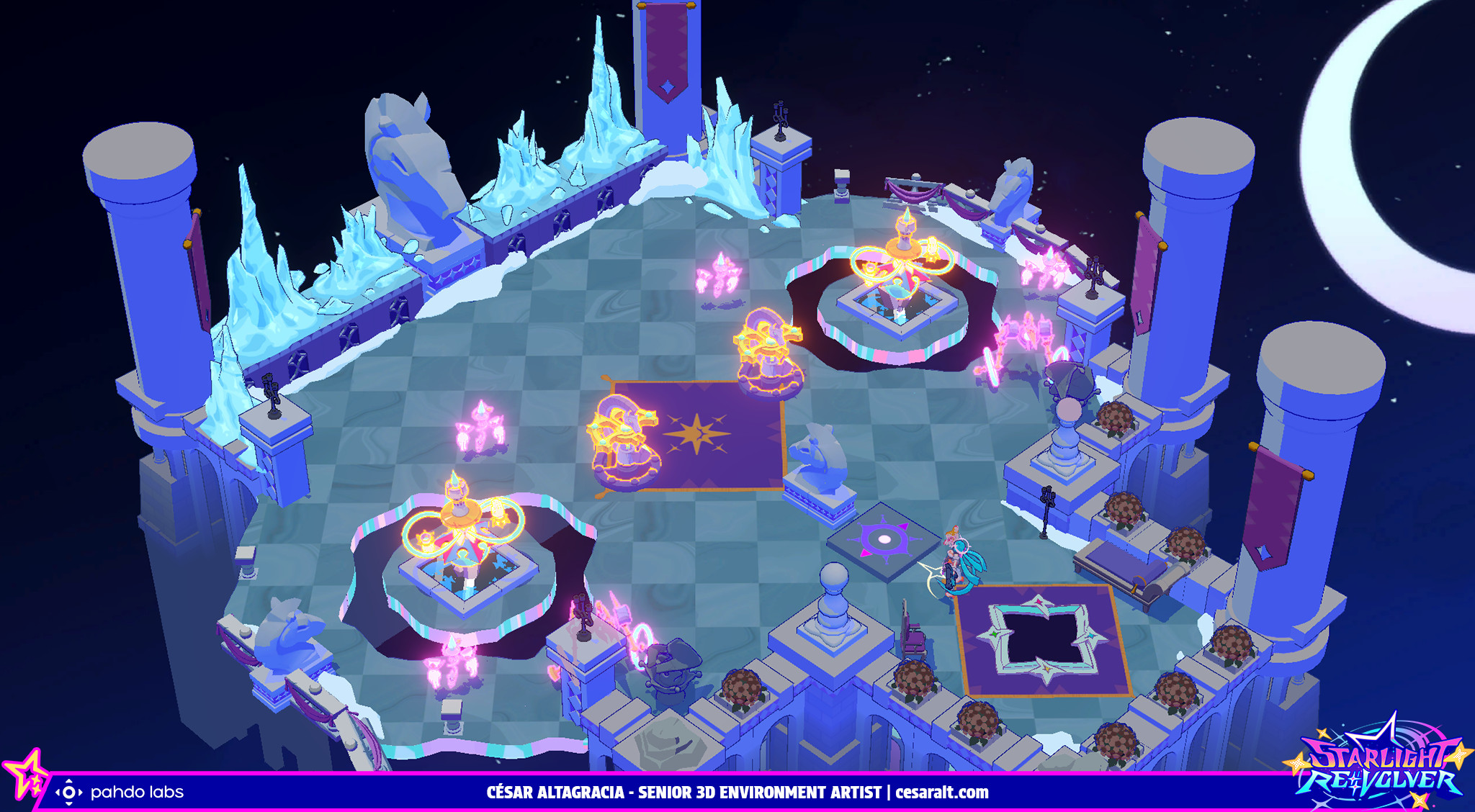 Fia's Mirror is Starlight Re:Volver's second combat biome. A frigid, dark and gothic area with many board game motifs. I modeled many modular pieces, props and decor, as well as their textures. I also assisted technical art by turning my models into prefabs and applying their outline shader and shadow volumes.